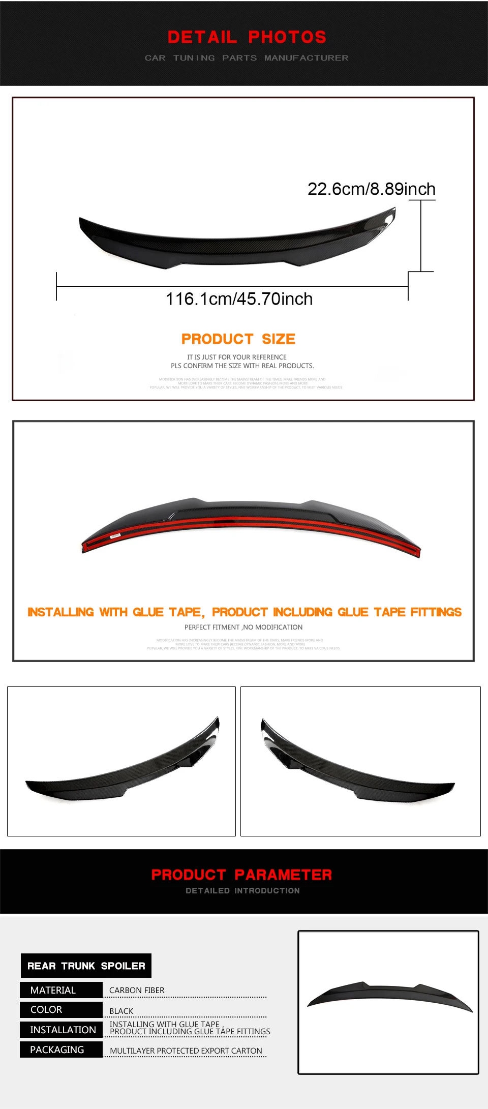 5.Car rear trunk spoiler are designed to factory specifications for easy installation and clean,installed with self-adhesive tape.peel off the tape on the back, then stick the spoiler on the lid of the trunk. It is easy to clean in daily use.